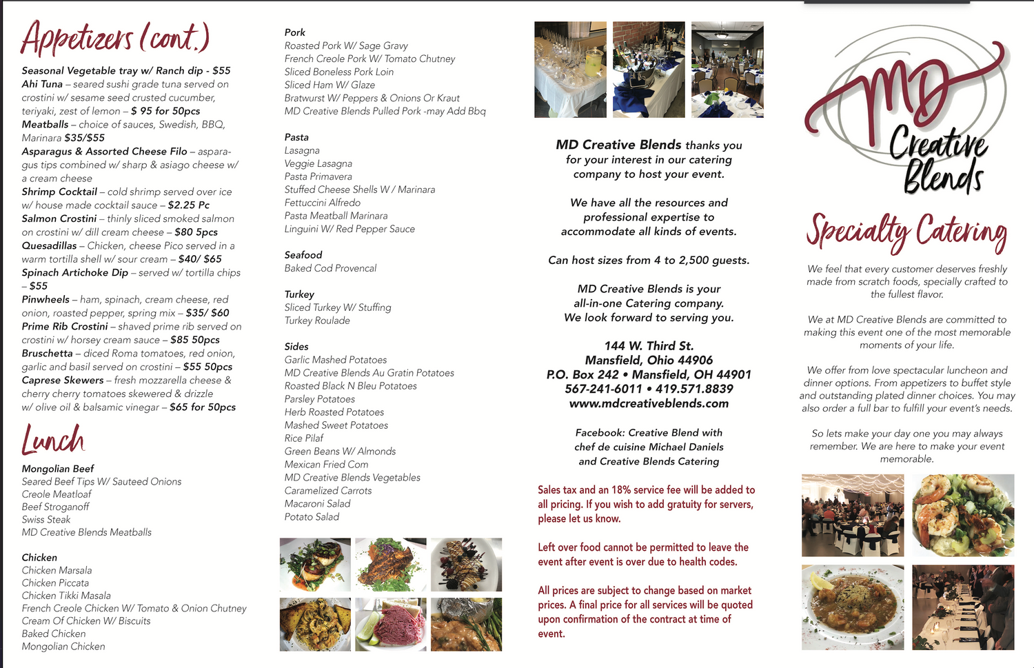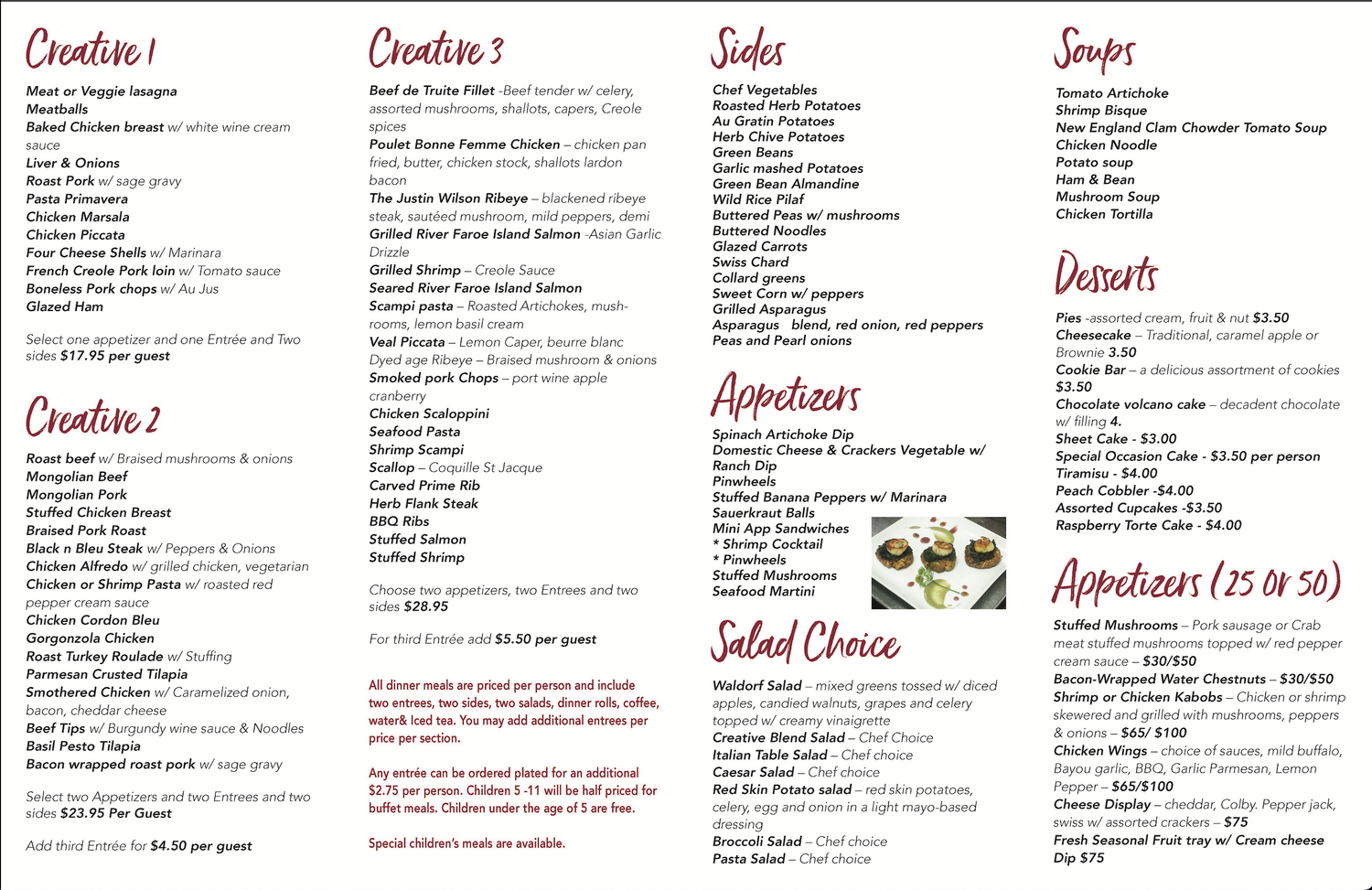 All dinner meals are priced per person and include two entrees, two sides, two salads, dinner rolls, coffee, water& Iced tea. You may add additional entrees per price per section. Any entrée can be ordered plated for an additional $2.75 per person. Children 5 -11 will be half priced for buffet meals. Children under the age of 5 are free. Special children's meals are available.
